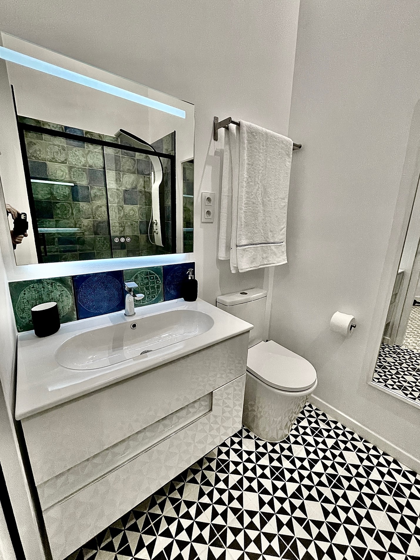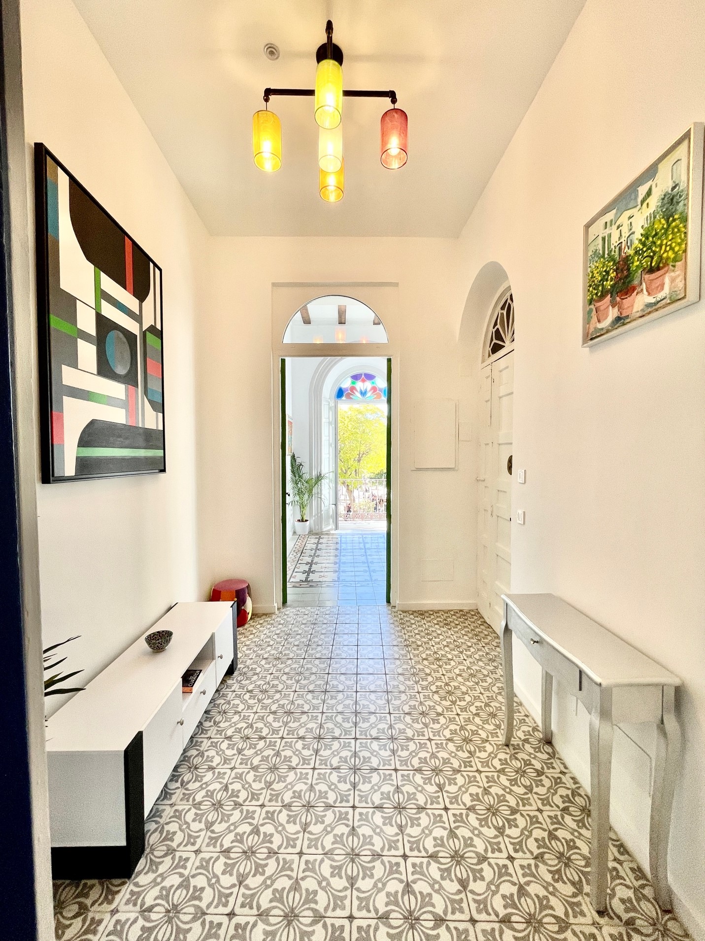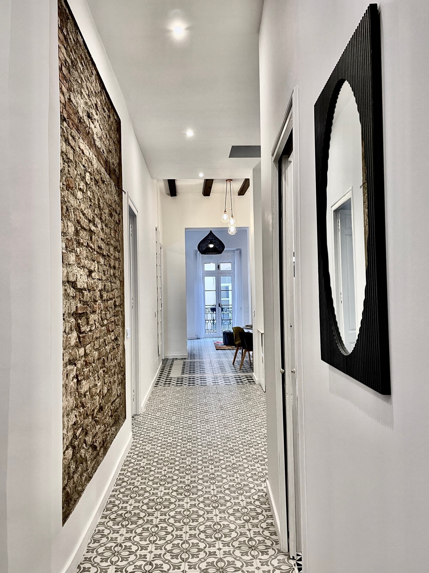 This apartment features an airy 4.2 meter high wooden beamed ceilings, the original 18th century stone tile floor, tall 3 meter tall original doors, 6 sets of French windows, 4 original stained glass windows. A modern kitchen with high quality appliances, queen sized orthopedic beds with cotton 300 count bed sheets, 3 modern bathrooms, Airzone air conditioning/heaters and much more including a complimentary bottle of wine waiting for your arrival.